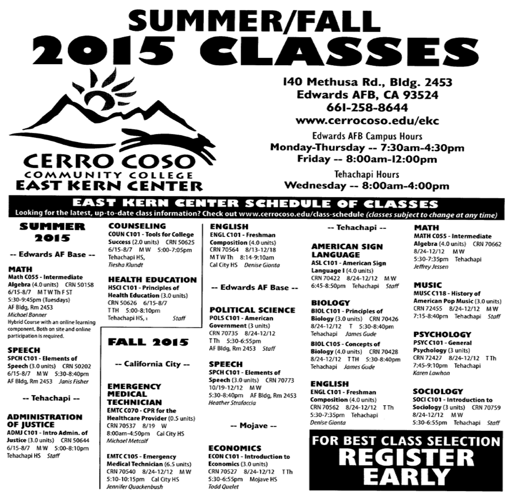 Economics 101 will be offered Tuesdays and Thursdays at Mojave High School from 5:30 to 6:55 pm. The semester begins August 24th and ends December 12th. Concurrent Enrollment at Cerro Coso is free for most high school students, regardless of high school; and even the books are free for students of Mojave Unified from Mojave or Cal City. Classes are only $140 for non-high school students. Call Kristin Hanle at 661-258-8644 for questions (M-Th 7:30-5:30; F 8-12), or visit the Cerro Coso website at www.cerrocoso.edu.