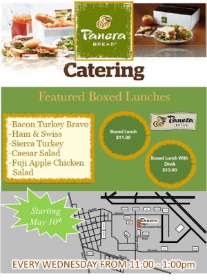 May 1, 2017. The Mojave Foundation is proud to announce that Panera Bread will be selling box lunches on the Airport every Wednesday starting May 10th from 11:00-1:00. Panera Bread will provide a choice of 5 box lunches out of building-1, at 16922 Airport Blvd, as well as drinks. This is a test case to prove out the concept, and if this works there is a possibility of a more frequent schedule and permanent establishment here in Mojave. The Mojave Foundation is committed to bringing more amenities to our community, and Panera Bread represents a growing number of national brands to express an interest in investing here. We welcome Panera Bread, and encourage all residents and employees to sample the lunches starting Wednesday the 10th.